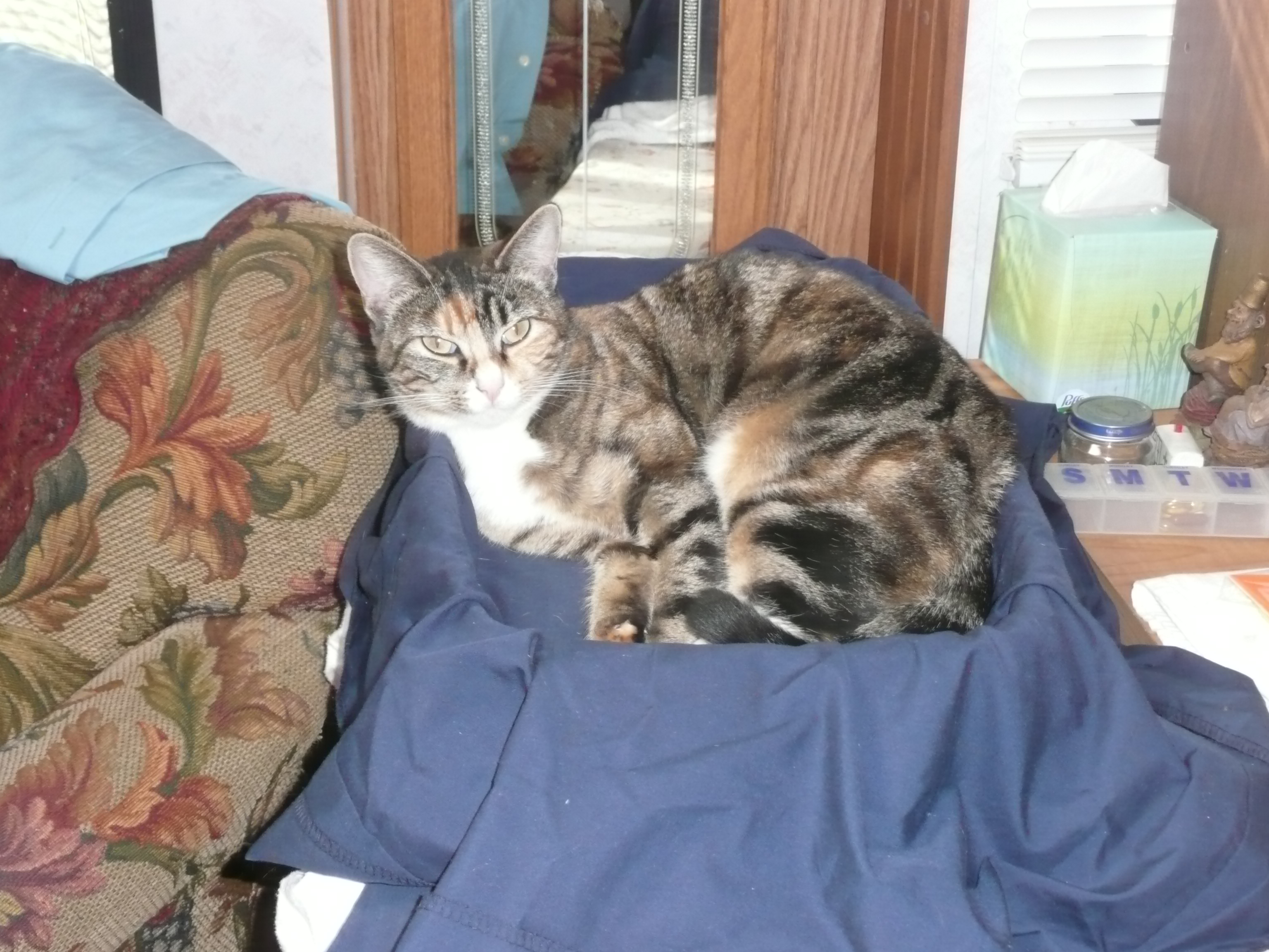 Emily moved and her cats came to stay. This is Grissabella, named after one of the cats in the musical CATS. When I say Grissabella, or Griss for short, I see it spelled, Grizz, so if you see her name spelled that way, it is still the same cat. Grizz’ partner came too, but ran off before we could get him acclimated, I’m hoping to see him around. Good luck, Busterford Jones aka Buster, whose name also came from CATS.