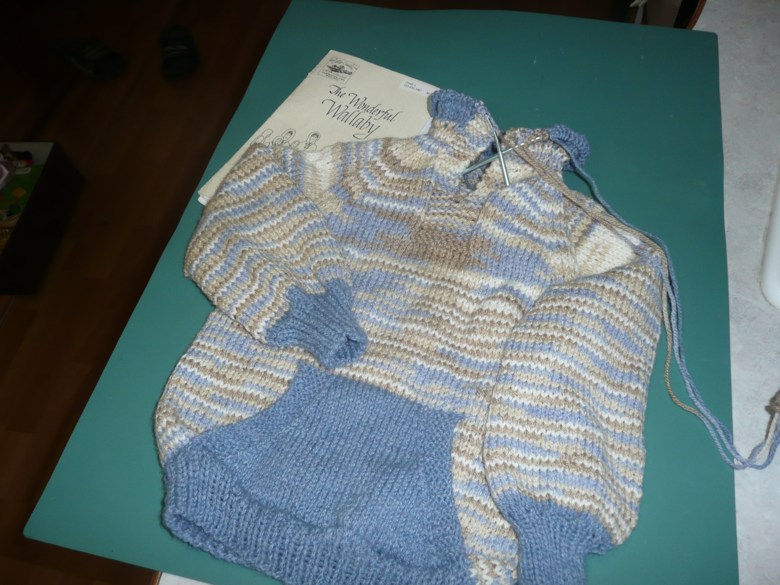This is “The Wonderful Wallaby” by Cottage Creations. I’s like a sweat shirt knit from the bottom up, only seaming is at the top of the hood and a few stitches under the arms. So easy! My grandsons love them. Usually I make the sweater all one color, thought I’d try accents this time.