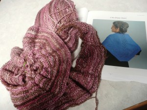 Not a lot to show for my knitting time that is divided between four projects. Here is a picture of the newest cast on, from Cheryl Oberle’s folk Shawls, Litla Dimun. I have wanted to knit this one ever since I bought the book. My daughter, Mary, gave me some of her home spun yarn. You can find Mary’s pretties at Hopeful Days.