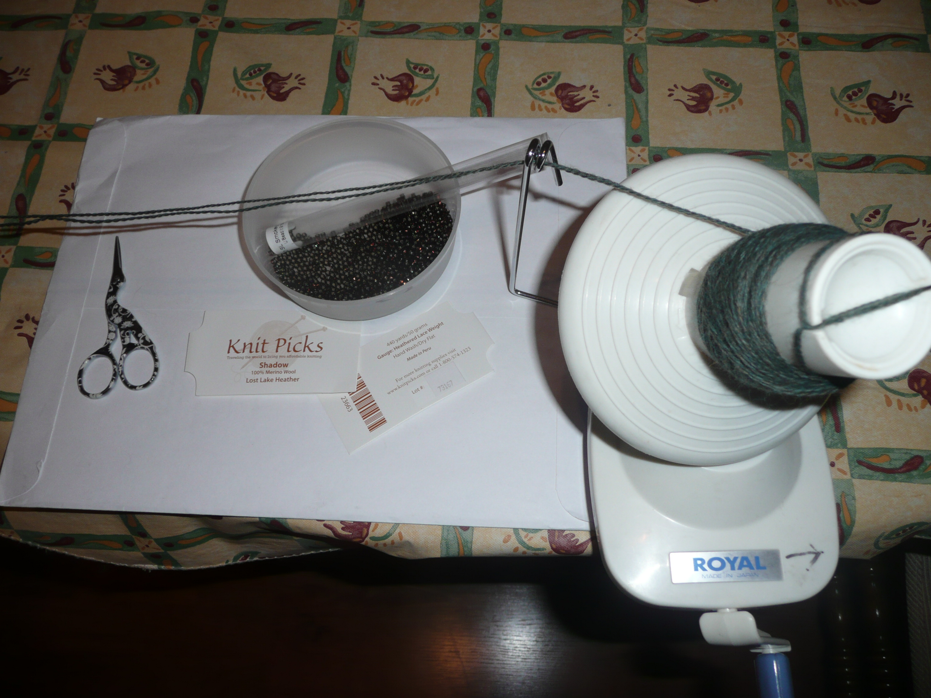 Some yarn skeins come twisted on to itself. See ivory yarn below. I untwist the skein and spread it around the swift. I thread the yarn on to my ball winder.