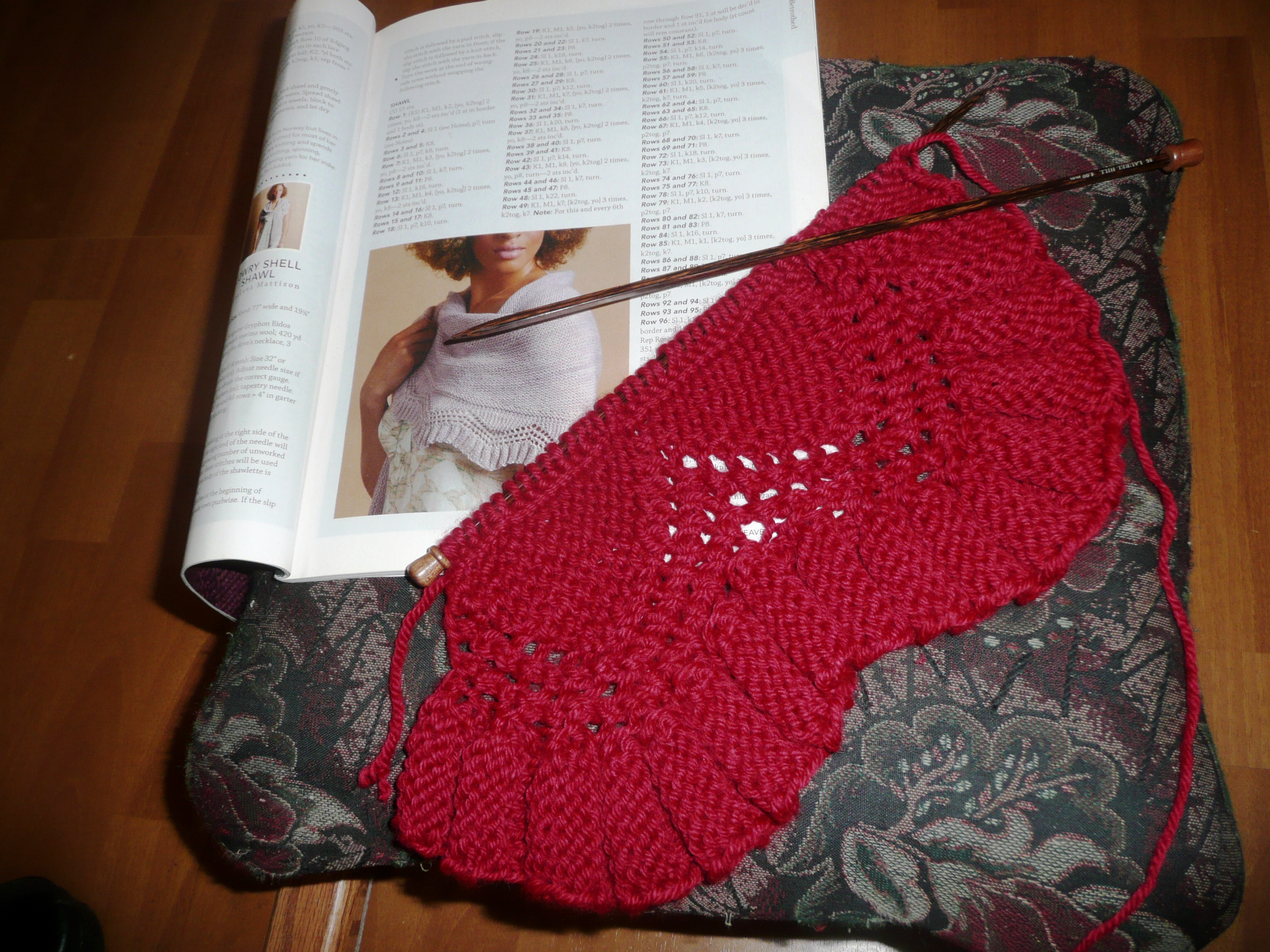 I have had Cowry Shell Shawl on my to do list since I saw it in Interweave Knits Accessorues, 2011. Right after I saw the pattern I did the first 96 rows – that makes one scallop – and liked it a lot. I wanted soft, smooshy yarn with good stitch definition. I admit I am a yarn snob, but knitting this in Red Heart Soft, 100% acrylic, in Wine (looks Christmasy Red to me), is meeting all my expectations. It will be such a warm cozy shawl this winter.