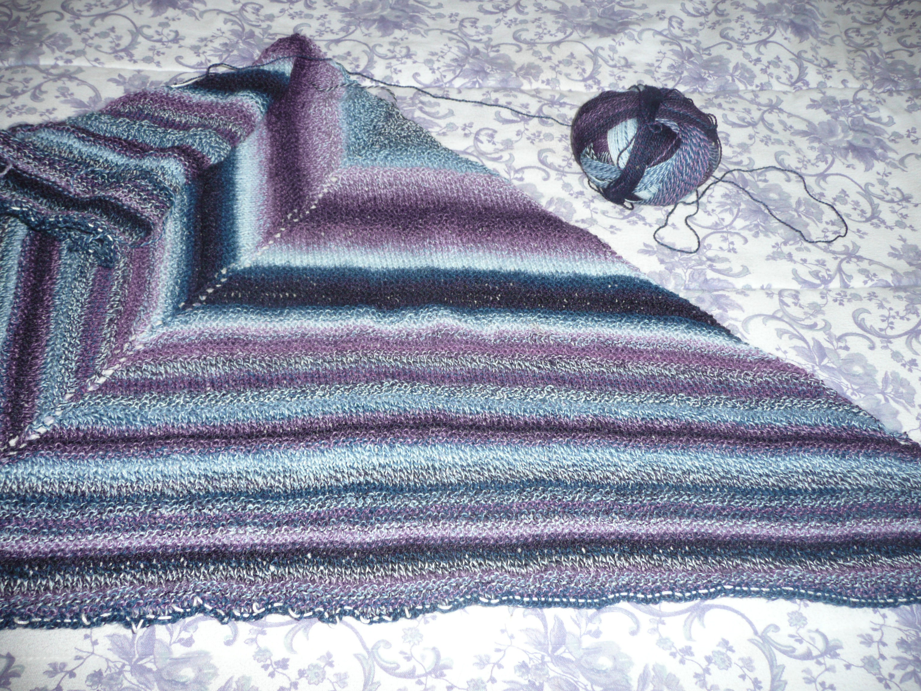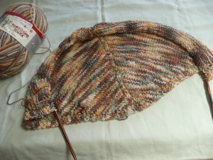 Now I needed something to kind of mindless to work on, enter Holden Shawlette. I’m using Fortissima Socka in this pretty autumn colorway. Right now, it’s just: