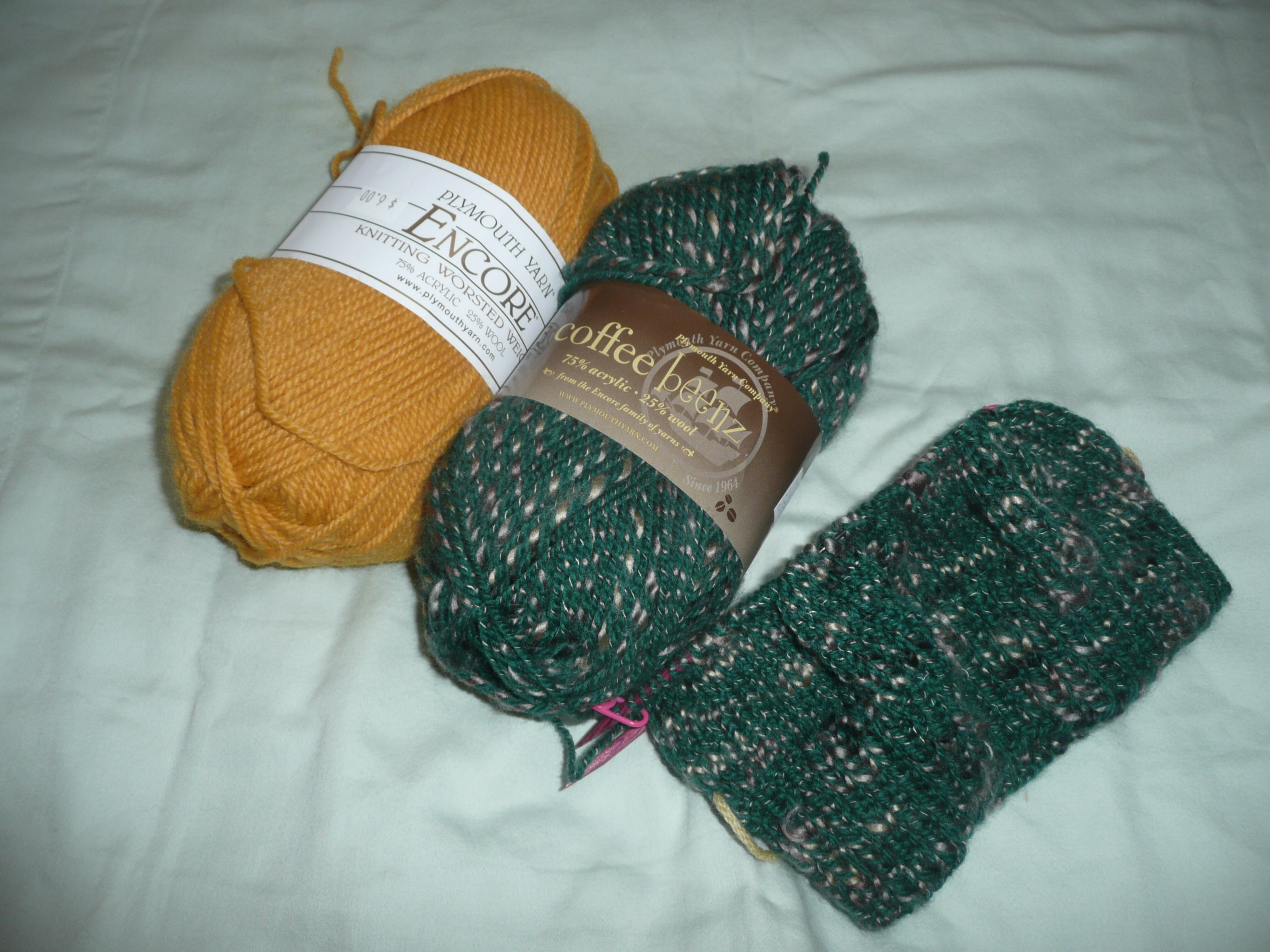 Since Wallaby Sox was pouting; Wallaby Coffee Beanz for an almost 2 year old whose mother does not drink coffee got started. I love the Coffee Beanz yarn. After I started W-CBz, I realized mom is Oregon Ducks FAN. So had to find a gold to add a couple of stripes to one, maybe both sleeves.