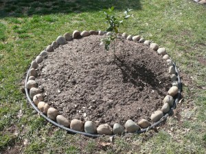Grass will be removed inside the circle, tree planted, mulched thickly, river rock will border each planting.