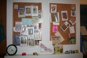 My wall of patterns, ideas of quilts to create.