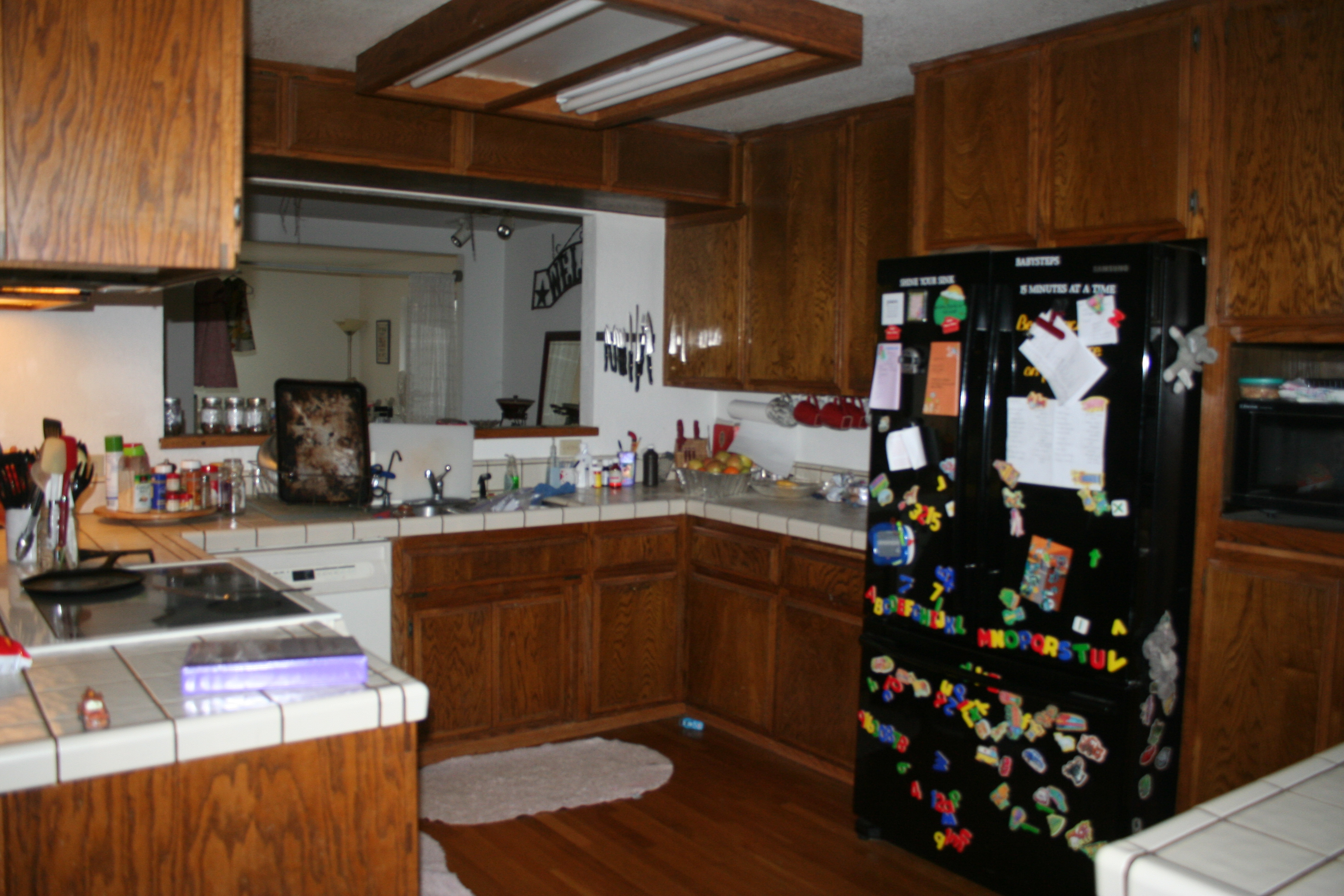 Back to the kitchen. The fridge used to be cream with no magnets, but this one is hear now. Nice and big with lots of storage and counters. And the upper cabinet on the corner that caught every one’s head.