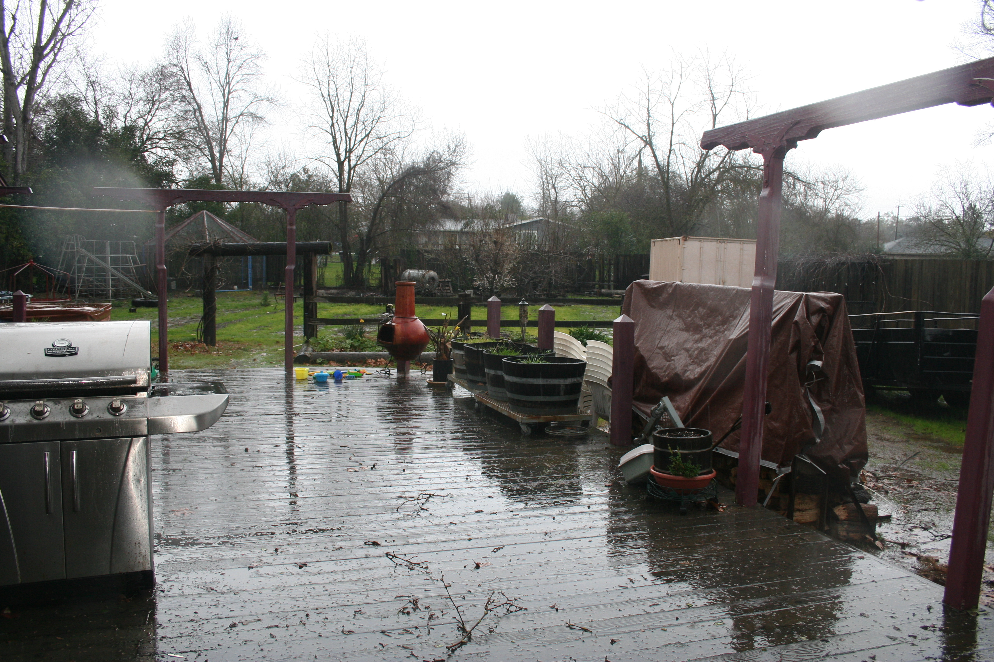 And the back yard. The deck we put on, it was brimmed with flower pots. The wine barrels that would grow sunflowers in the summer, the fire pit to light on nights of laughter, the modesty curtain for those in the hot tub, the piles of veggies for sale.