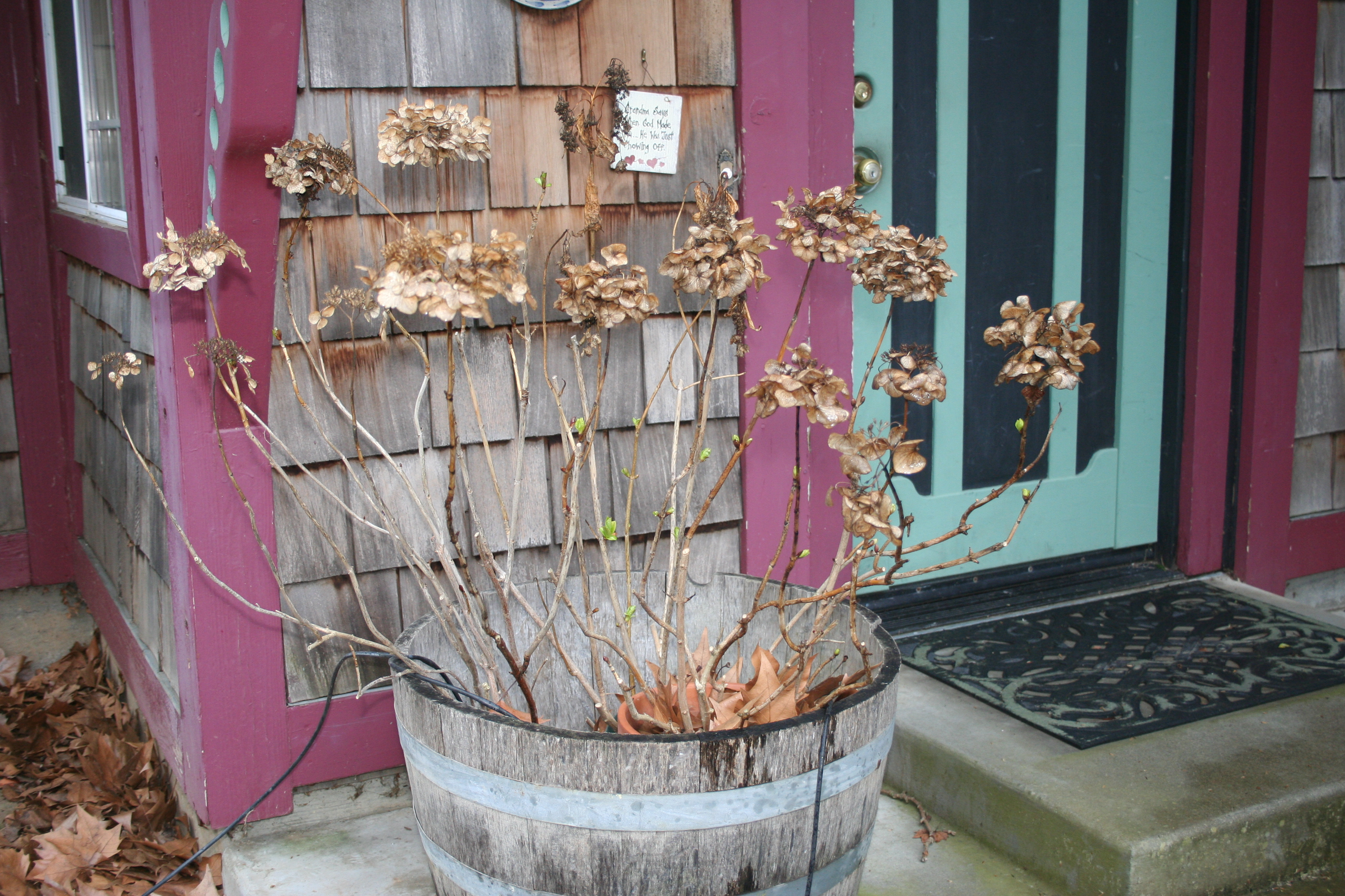 The hydrangea bush by the front door, right now it is all dry but in bloom it is beautiful. The plants have been in the barrel so long that the roots have grown into the bottom.