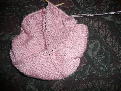 I will not begin to tell you how long it took me to get to this point. I worked and worked with the wool/silk, then finally got out some worsted yarn so I could see the stitches and have something substantial with which to knit. I figured out the pattern, it wasn’t really that hard just fiddly, got my fingers retrained to work with doublepoints again and knitting is going smoother. My Ravelry project page.